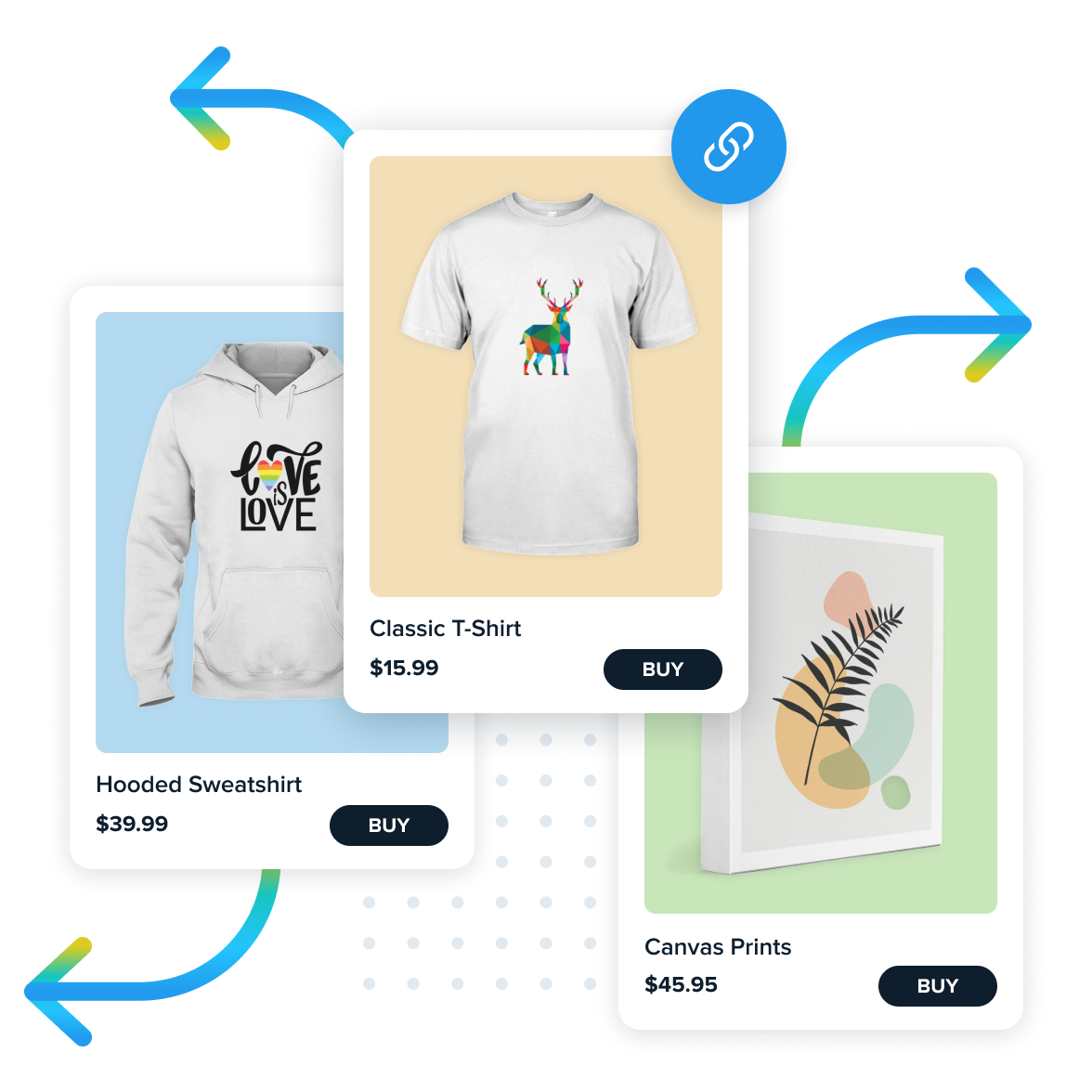 Share the product link on your website, facebook, IG or even slack channel. No inventory, no payment processing. Create, share and sell everywhere!